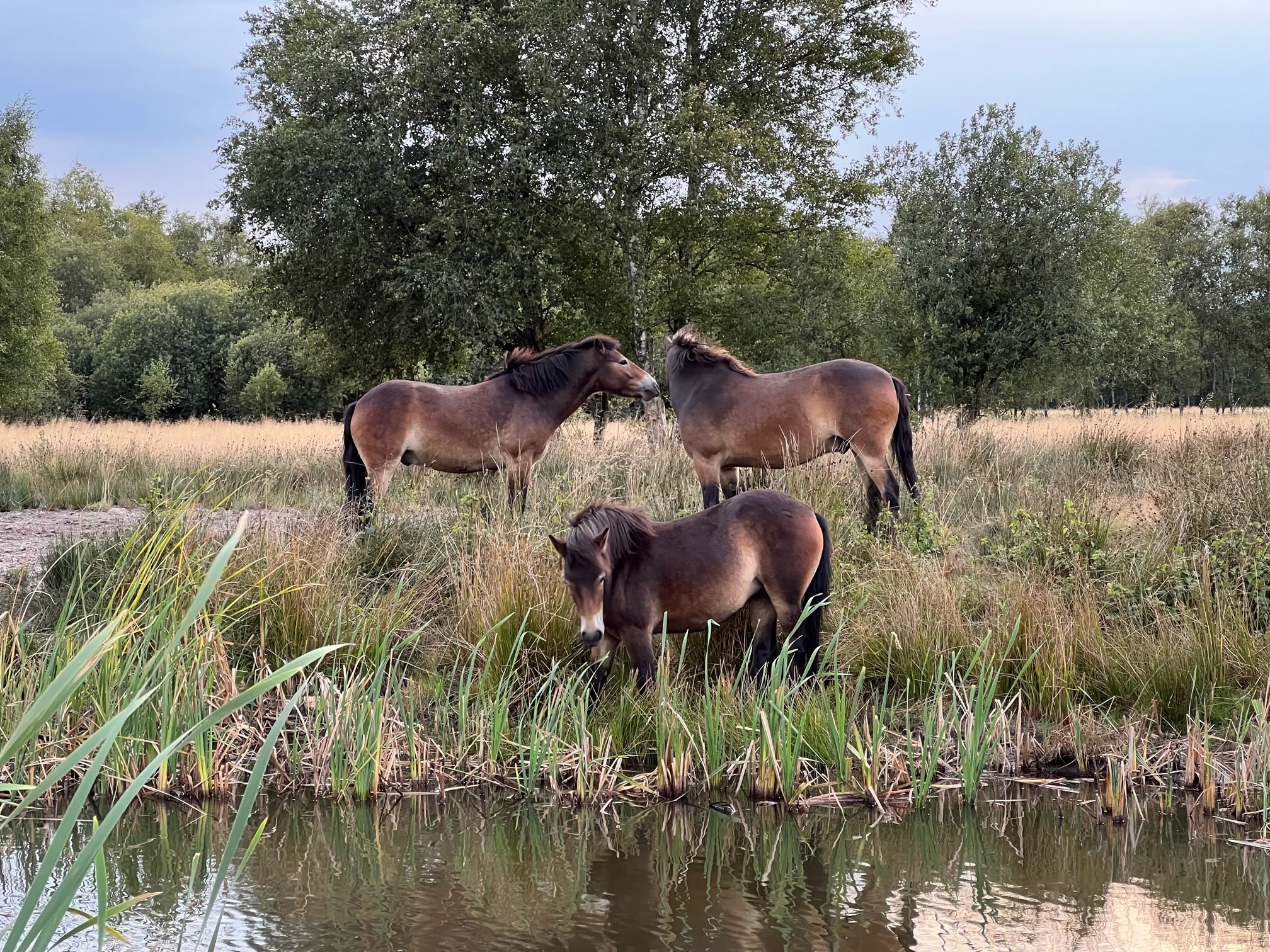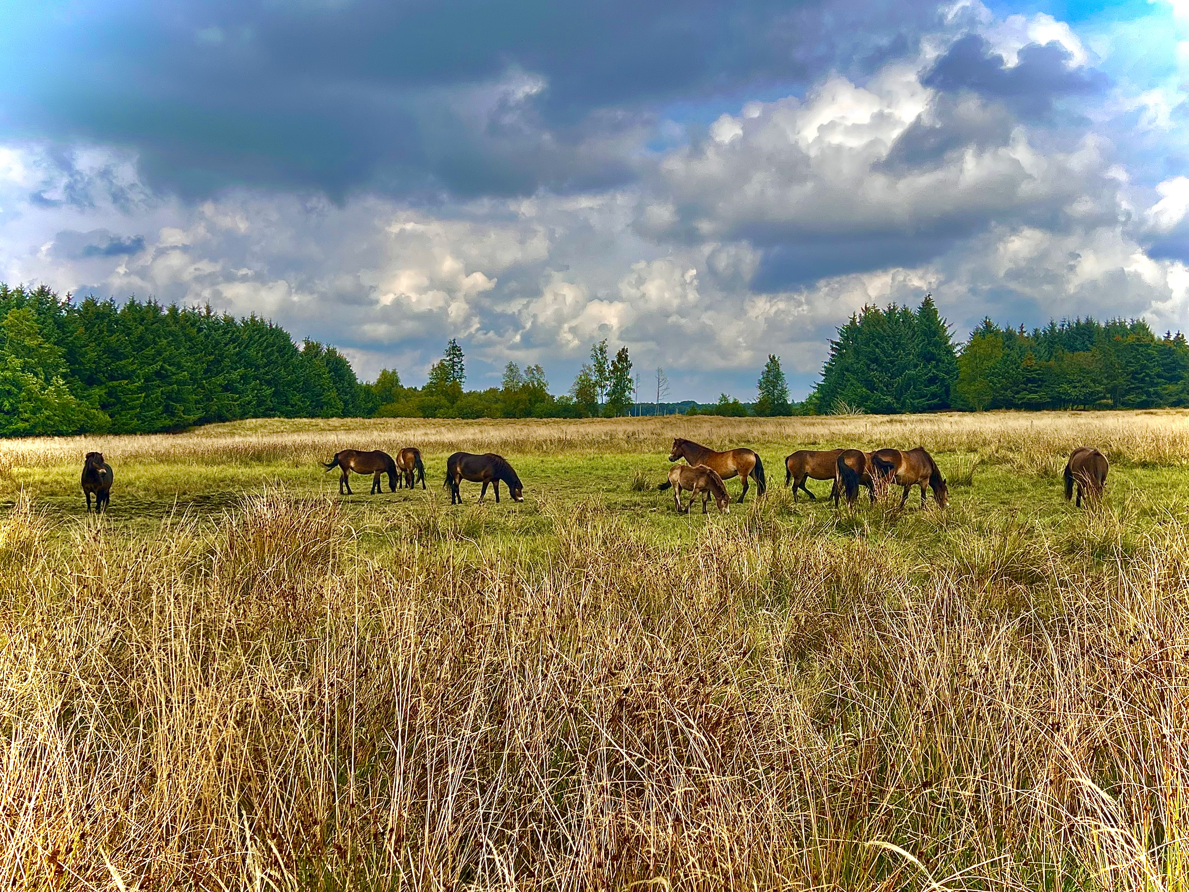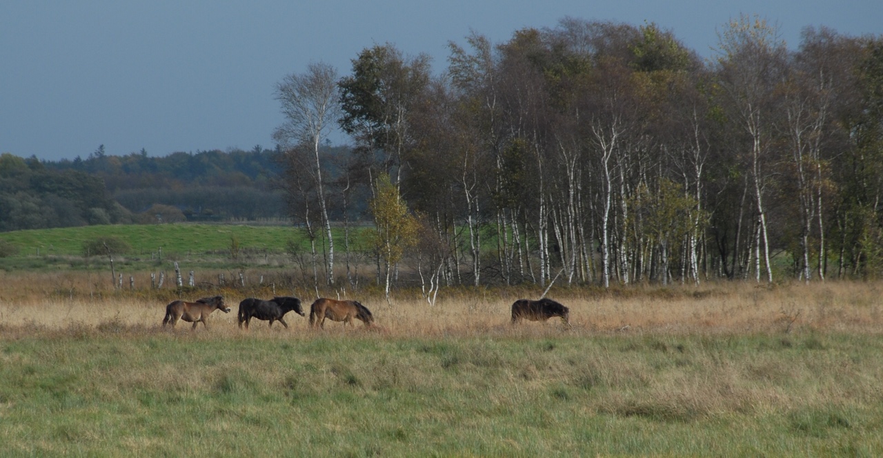 Vi har pt. Exmoor ponyer på arealet. Først fik vi fire vallakker i 2020, i 2021 kom fire hopper til. Den ene viste sig at være ifolet og i foråret 2022 blev det første føl født i Kragelund – en lysåben mose. Sommeren 2022 tog vi springet og fik en hingst. Det er gået over al forventning. Flokken går stadig samlet, men vallakkerne har forstået, hvem der er chef i firmaet.