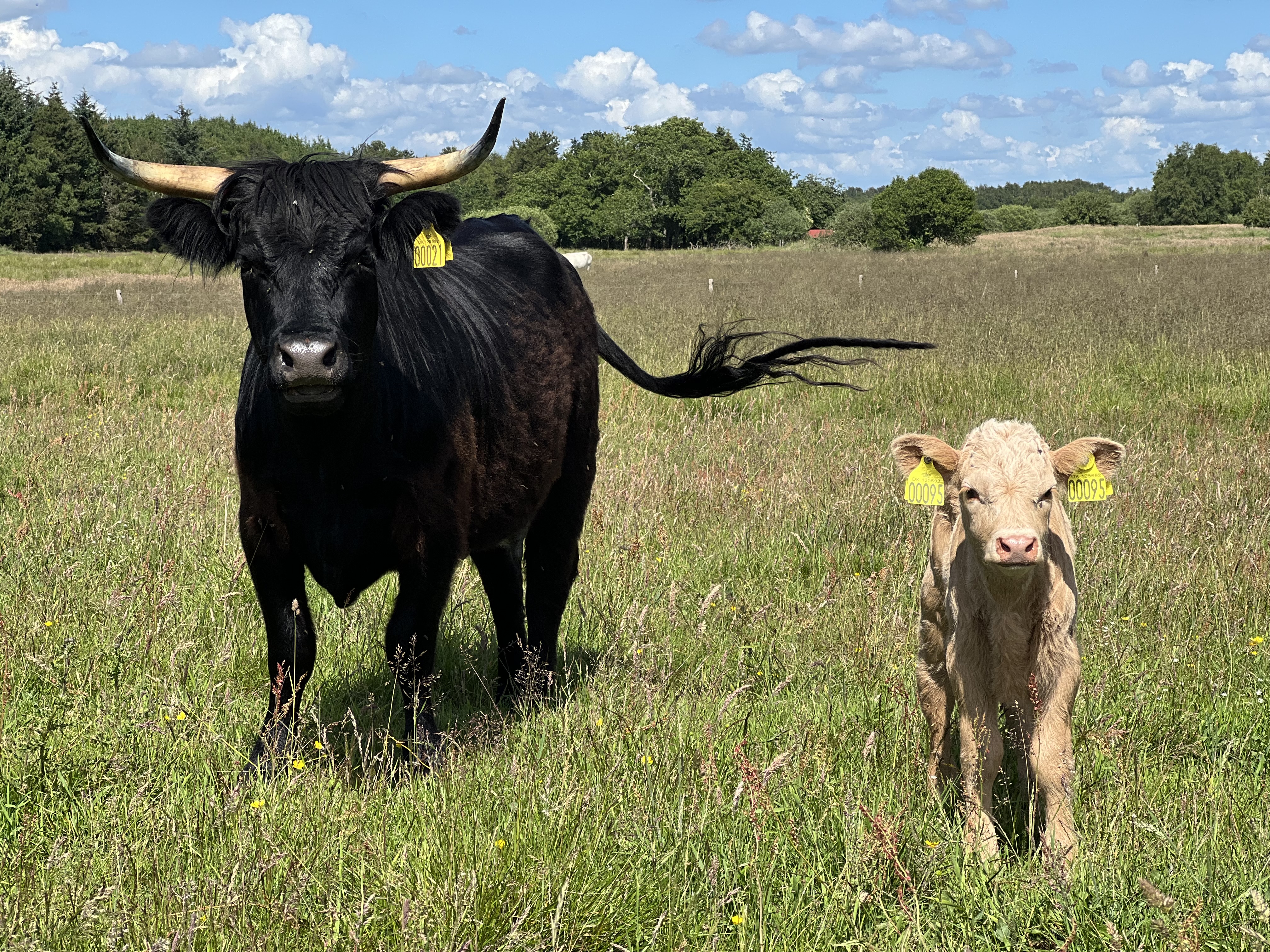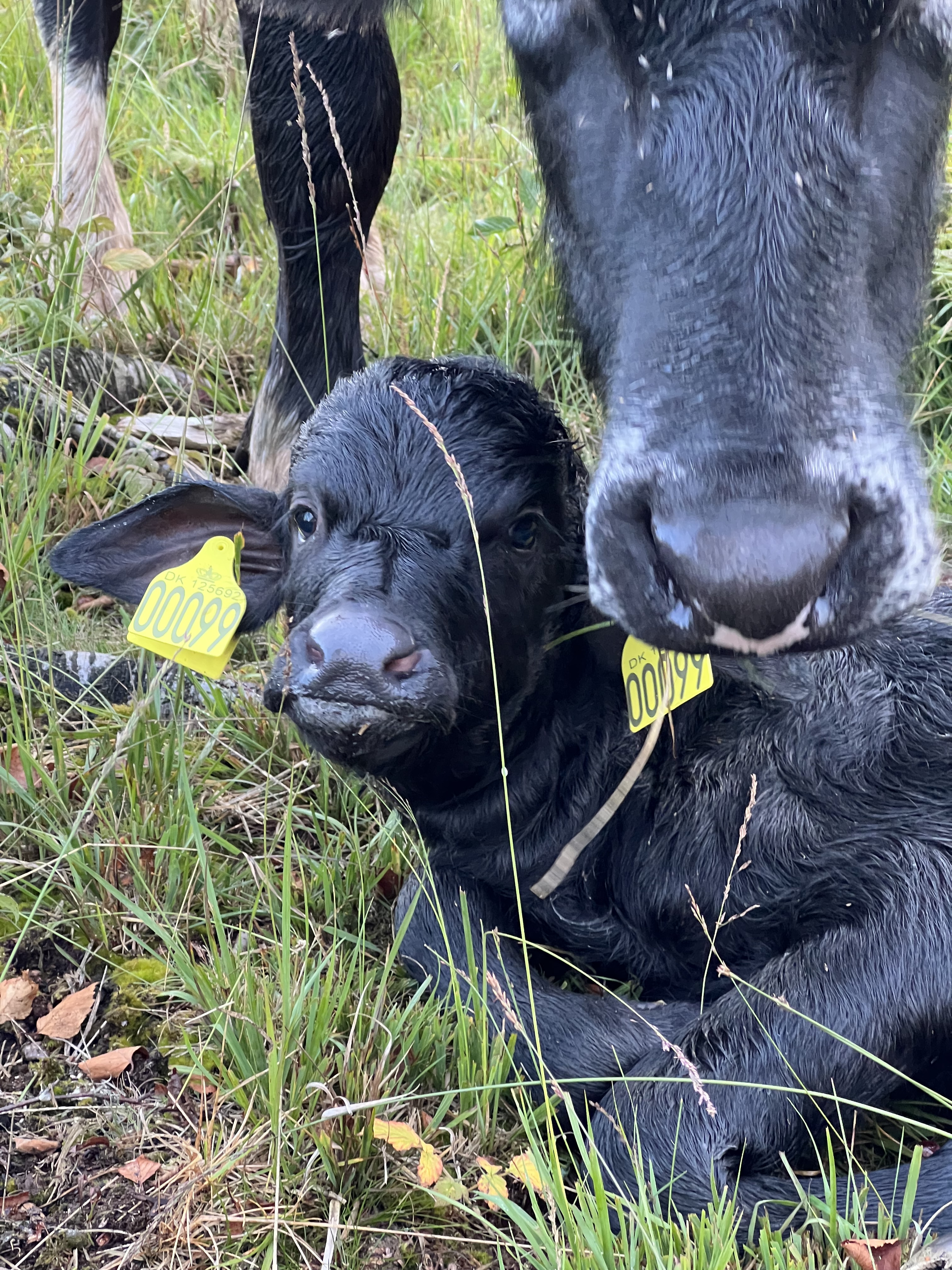 Når vi har dyr, som snart skal kælve, fole, fare og lemme, intensiverer vi vores tilsyn af to årsager. Dels for at kunne komme til undsætning, såfremt kælvningen ikke forløber problemfrit og dels for at kunne øremærke kalven eller kiddet så hurtigt som muligt efter fødsel. Køerne går som oftest for sig selv for at kælve og det kan nogle gange være en udfordring at finde koen. Andre gange findes koen nemt, men koen ønsker ikke at vise os, hvor den har lagt kalven af. Rent praktisk gør vi det, at vi er to mand om opgaven. Et reb rundt om halsen på kalven – ofte bliver den blot liggende – og medens kalven ligger eller holdes fast af den ene, sættes øremærkerne i af af den anden. Manden (m/k) med rebet har samtidig en møggreb med til at holde koen på behørig afstand, såfremt hun ikke værdsætter barselbesøget. Det giver meget sjældent anledning til udfordringer. Er der optræk til ballade – typisk fordi koens moderinstinkter er meget stærke og hun er utryg ved vores tilstedeværelse, trækker vi os. Det er store dyr og dem skal man altid have stor respekt for. Alt andet er at spille hasard med sit liv og det er et øremærke ikke værd. Øremærker kan isættes senere, omend det er mere bøvlet. Vi kan faktisk få dispensation til at øremærke kalve ved “indbinding”, men dette er hverken noget vi har benyttes os af, eller agter at benytte os af. Uanset hvad skal nye kalve registreres i løbet af syv dage.