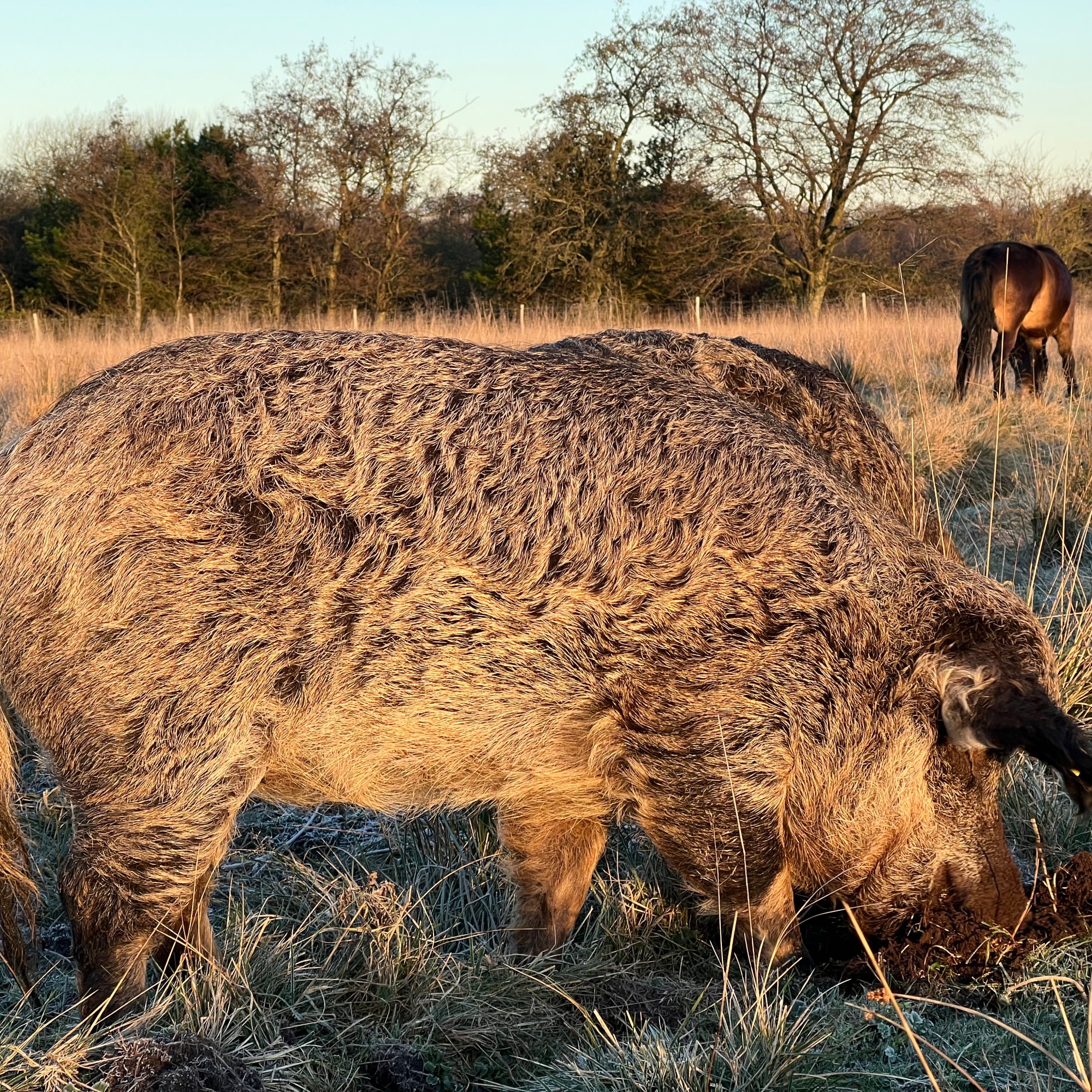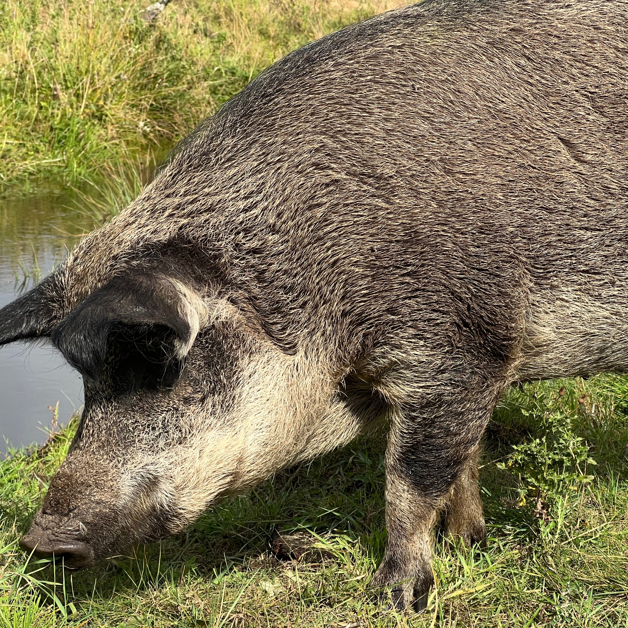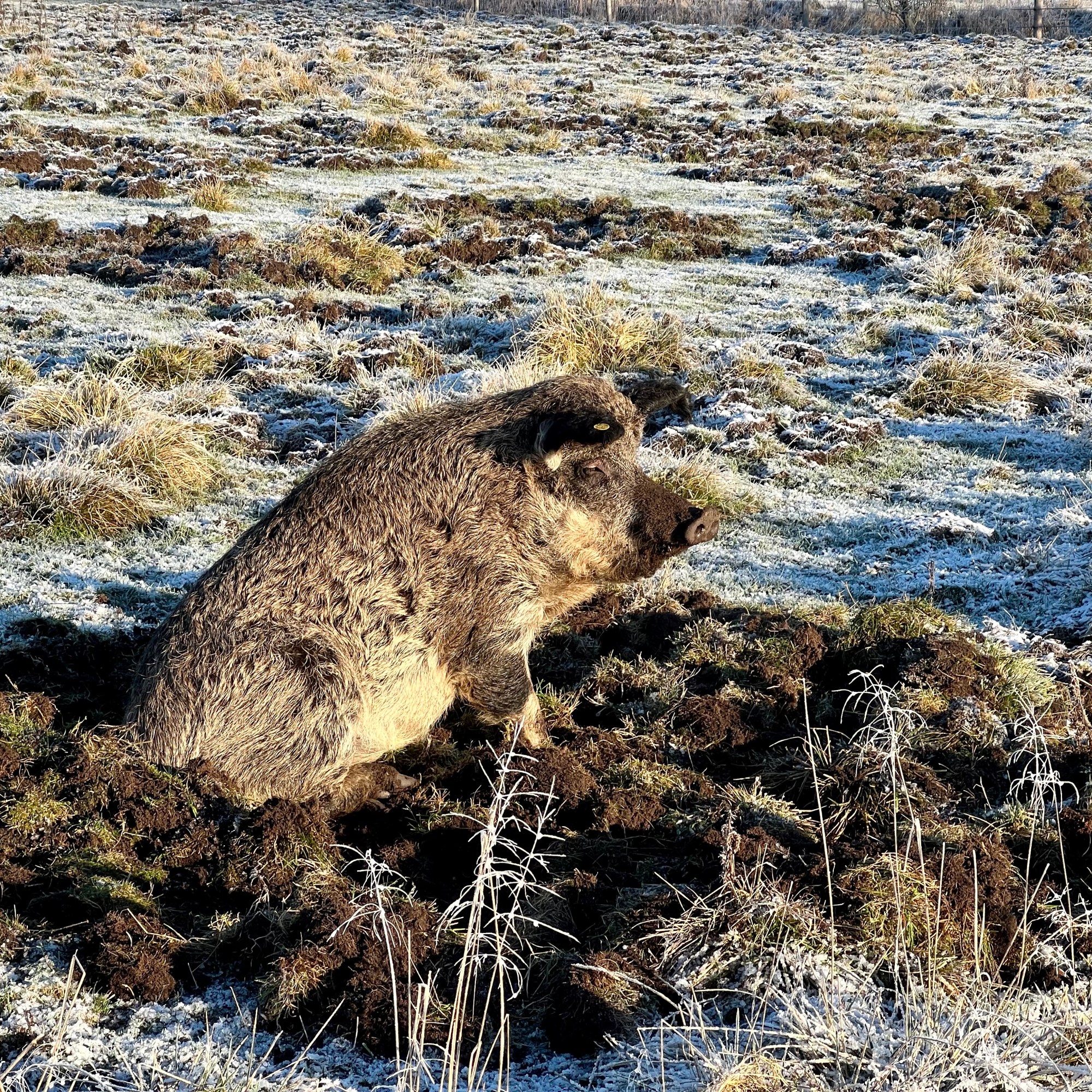 Om vi havde valgt en anden race end uldgrise, tror jeg ikke havde gjort den store forskel. Grise er ikke så degenerede. Uldgrisen er kendt for at være en sund og robust gris med et godt hårlag, som gør den særdeles velegnet til at gå i det fri hele året. I sommerhalvåret smider grisene en stor del af deres store tykke vinterfrakke, ligesom vildsvin gør. Vores grise har hytter, som de kan benytte, men jeg tror, at de primært sover i deres selvlavede reder forskellige steder på arealet. Grisene kommer utrolig meget omkring og oftest er de forholdsvis lette at finde til trods for, at de ikke rager så højt op som ponyer, bøfler og kreaturer.