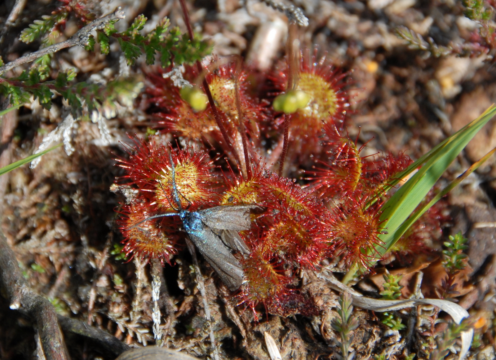 Rundbladet soldug findes hist og her i mosen, hvor der er blottet jordoverflade. Dyrenes tramp og roden er dermed med til at forbedre levevilkårene for arten.